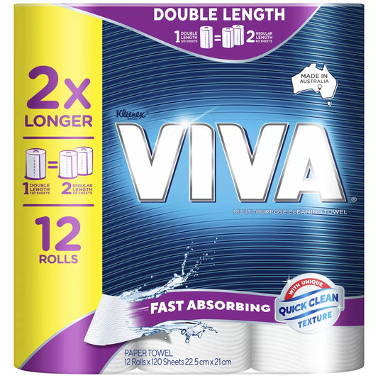 Viva Paper Towels 12 x Double Length Rolls 120 Sheets Each Maximum Absorbency